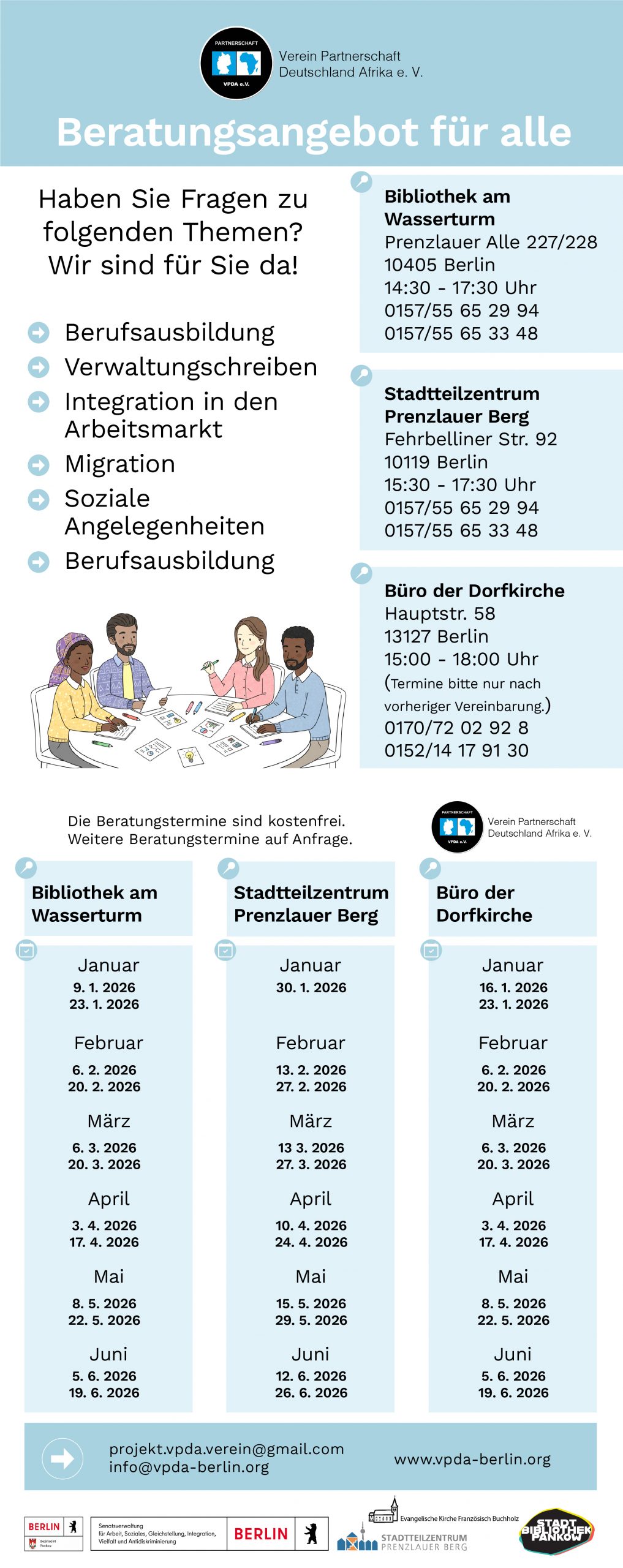 Haben Sie Fragen zu folgenden Themen? Wir sind für Sie da! Berufsausbildung Verwaltungschreiben Integration in den Arbeitsmarkt Migration Soziale Angelegenheiten Berufsausbildung Besuchen Sie uns an einem der folgenden Orte für eine Beratung: Bibliothek am Wasserturm Prenzlauer Alle 227/228 10405 Berlin 14:30 - 17:30 Uhr 0157/55 65 29 94 0157/55 65 33 48 oder: Stadtteilzentrum Prenzlauer...
